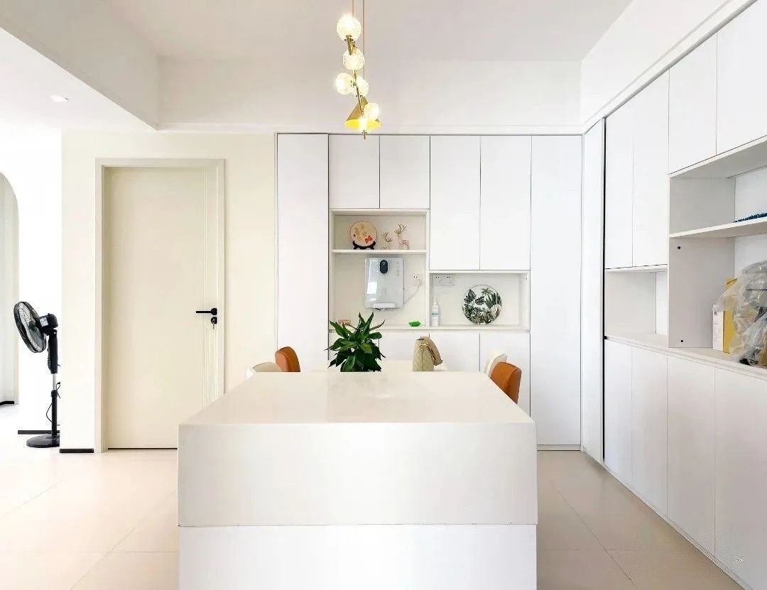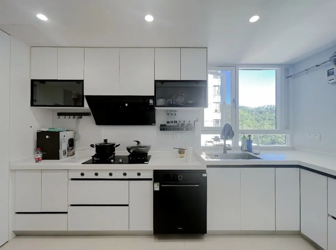 黑白經(jīng)典配色的廚房,無(wú)論何時(shí)都耐看!業(yè)主喜歡廚房看起來(lái)干干凈凈的,因此選擇了白色亞光柜體+白色石英石臺(tái)面+黑色電器,電器也盡量選擇入式電器,創(chuàng)造出極簡(jiǎn)又時(shí)尚的外觀。