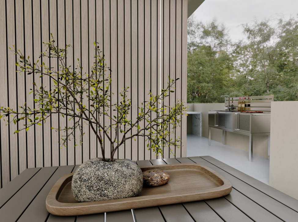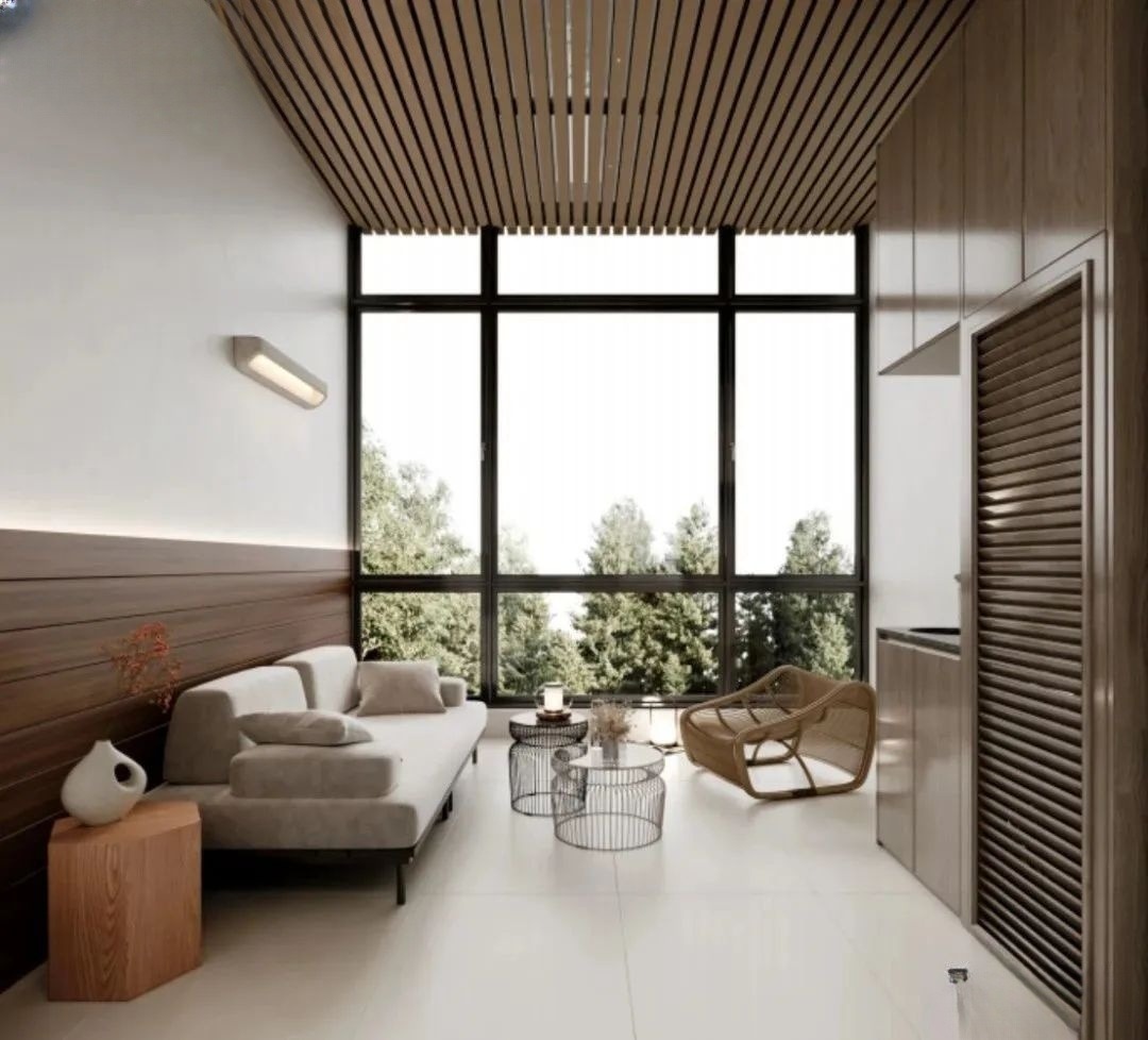 原木格柵線條與窗外樹影交相輝映,一張沙發(fā)、一張?zhí)僖?,簡潔不失大方不失?yōu)雅韻味。